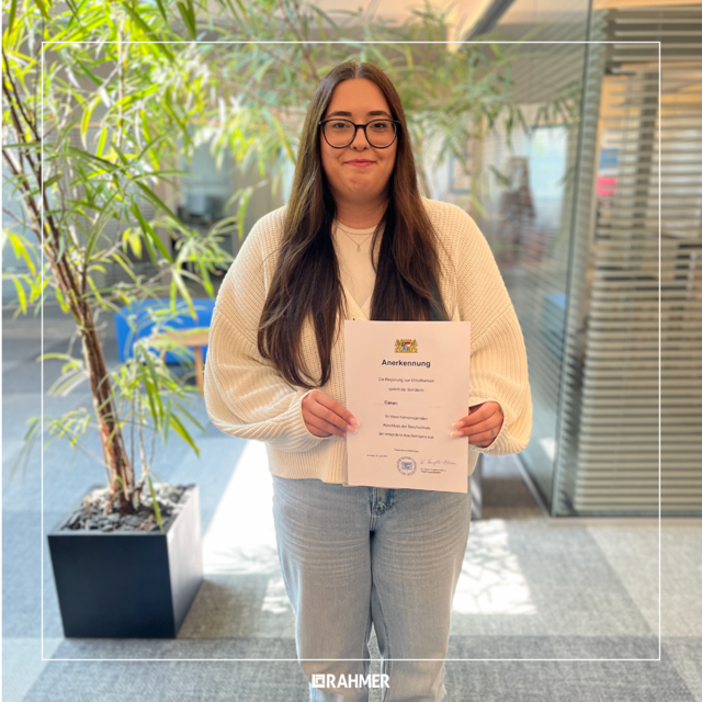 Wir freuen uns sehr, dass Canan auch nach ihrer Ausbildung Teil des RAHMER-Teams bleibt. Mit ihrem Know-how, ihrem Engagement und ihrem Blick für Details wird sie einen wichtigen Beitrag zu unserer Buchhaltung leisten.